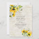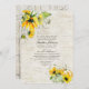 A rustic funeral or memorial service invitation featuring watercolor sunflower elements over a faux birch background. Copyright Elegant Invites, all rights reserved.