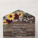Bring warmth, charm, and effortless functionality to your wedding stationery with this rustic all-in-one wedding invitation featuring sunflowers and burgundy roses. Designed with a rich woodgrain background and soft string light accents, this invitation captures the cozy, romantic feel of a countryside celebration while keeping everything beautifully organized in one piece.