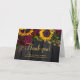 Rustic elegant wedding stylish thank you template card on dark brown barn wood background featuring beautiful sunflower and burgundy roses bouquets. F+++++++++++++++++++ Suitable for elegant summer or autumn fall rustic countryside farmhouse barn garden backyard weddings.