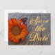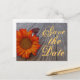 This design features a photo of an orange sunflower resting on wood, with a rustic stylish "Save The Date" text. Personalise the other side with the bride and groom's names, date and location. To change the font styles, click on the Customise it button.