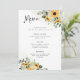 These beautiful and rustic wedding menus feature watercolor bohemian bouquets of golden yellow sunflowers and green botanical leaves with boho casual script typography, on a white background with warm neutral watercolor splashes of colour.