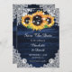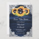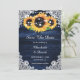 Navy blue and sunflower wedding save the date cards featuring sunflowers and white floral lace against a rustic wood background. Matching items available.