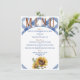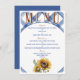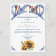 A rustic and lovely wedding menu sure to help entice your guests to enjoy your upcoming wedding reception with a blue and white background, sunflowers and easy text to update with your personal menu options.