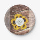 This design features rustic sunflowers on a wood backdrop. The sunflower wreath elegantly frames the wedding date. The yellow, green and brown colour tones create a rustic natural country garden feel. The opaque border highlights the sunflower centerpiece. Elegant wedding paper plate design with modern elements. Matching wedding invitations and other stationery items are also available.