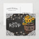 Stylish country wedding response cards featuring a rustic black chalkboard backdrop, bridal lace corner decoration, string twinkle lights, summer golden yellow sunflowers, a winery wooden barrel wiith your initials and a piece of knotted string.