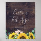 This rustic sunflower wood custom text sign is perfect for a country wedding. The bohemian floral design features yellow sunflowers, blush pink flowers and hunter green eucalyptus greenery in watercolor with an elegant modern boho feel. Customize the wording to say anything you'd like! This sign can be used for cards and gifts, guest book, wedding hashtag, favors, dessert bar -- anything! It can be used for a wedding, bridal shower, rehearsal dinner or any event. The line of text at the bottom of the sign can be personalized with the date, the names of the bride and groom, or a short message like "Thank you". If you would like multiple coordinating signs, customize and add to your cart one at a time.