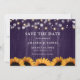 Rustic purple and sunflower wedding photo save the date cards featuring sunflowers and string lights against a barn wood background.