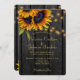 Elegant chic summer or autumn fall wedding stylish invitation template on dark brown barn wood featuring a beautiful sunflowers bouquet and strings or twinkle lights. +++++++++++++++ The invitation is suitable for elegant rustic country barn farmhouse weddings. +++++ Digital download available.