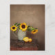 Sending sunny get-well thoughts with a vintage look photo of sunflowers and lemons on a kitchen table. Tones of Vermeer and Dutch masters in a modern photographic painting style.