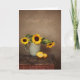 Sending sunflowers and sunny lemons thank you with a vintage look photo. Sunflowers and lemons in a rustic vase on a kitchen table. Tones of Vermeer and Dutch Masters in a photographic painting style.