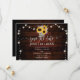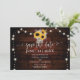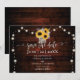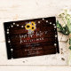 A flower pot, made of tree bark and filled with sunflowers, lavender, wheat and baby's breath make for a lovely illustration, hand-painted in digital watercolor, that decorates this rustic elegant wedding save the date that also features a red wood board background and strings of lights. Romantic and charming, it is a lovely choice for a barn wedding, an outdoor wedding, a garden wedding or any rustic setting.