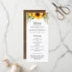 This rustic wedding program features a beautiful watercolor graphic of fall sunflowers and greenery on a white background. The front offers custom text for the ceremony. The backside features a rustic wood background and custom text for your wedding party names.