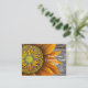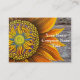 A stylized abstract depiction of a sunflower with bold sweeping lines and striking color contrasts. The sunflower itself rendered in shades of golds, yellows and oranges and is set on a beautiful rustic barnboard background.