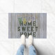 Stylish rustic country front door mat features "Home Sweet Home" text with forest cuttings graphic on faux weathered wood background