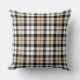 Elegant seasonal Christmas throw pillow design features a rustic black watch plaid Scottish tartan pattern in a neutral beige, tan, black and white colour scheme.