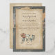 Cute and romantic wedding invitation with shiny gold foil on a rustic background featuring a watercolor vintage tandem bicycle and a flower basket.