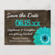 Rustic Teal Turquoise Daisy Barn Wood Save The Date Postcards with a distressed barn wood background and an teal turquoise blue gerber daisy in the corner.