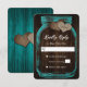 Rustic teal wedding RSVP card featuring a mason jar with two burlap hearts against a rustic wood background. Easily personalise this romantic teal RSVP online. Matching items available to complement this rustic teal wedding RSVP card.