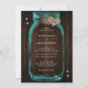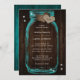 Rustic teal wedding invitation featuring a mason jar and burlap hearts on a barn wood background.