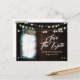Romantic rustic teal wedding save the date postcard featuring a mason jar and two burlap hearts against a rustic wood background adorned with string lights.