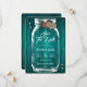 Rustic teal wedding save the date card featuring a mason jar and burlap hearts against a barn wood background adorned with twinkle lights. Easily personalise this romantic rustic teal wedding save the date online. Matching items available to complement this teal wedding save the date card.