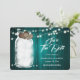 Rustic teal wedding save the date card featuring a mason jar and burlap hearts against a barn wood background adorned with string lights. Easily personalise this romantic rustic teal wedding save the date online. Matching items available to complement this teal wedding save the date.