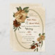 Unique wedding invitation featuring romantic rustic terracotta flowers and green leaves on a beautiful oval geometric frame.