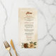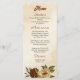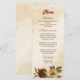 Unique wedding menu card featuring romantic rustic terracotta flowers and green leaves.