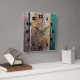 A square clock with a cool looking rustic texture as a background. Vertical stripes of red yellow and green paint flaking and peeling off a rusted old metal wall. Looks old and weathered and faded.