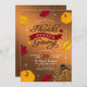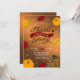 Rustic Thanksgiving dinner invitation features woodsy brown background, red & orange fall leaves, festive turkey, orange pumpkins and sparkles.