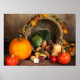 Poster with a photograph of a thanksgiving harvest, set on a rustic wooden table. Pumpkin, potatoes, squash etc... make up this bountiful collection of food. Colourful autumn leaves surround the cornucopia basket.
