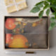 Tissue paper with a photograph of a thanksgiving harvest, set on a rustic wooden table. Pumpkin, potatoes, squash etc... make up this bountiful collection of food. Colourful autumn leaves surround the cornucopia basket.