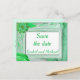 Inspired by the countryside this rustic theme green save the date is a great postcard to mail to your wedding guests. Featuring a rustic green display of beauty complete with green floral designs, an image of a wooden photo frame introduces the bride and groom. Above the bride and groom's name is "Save the Date" written in green cursive style. The back has a green background with more wedding details displayed. Purchase yours today!