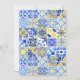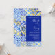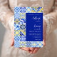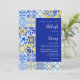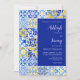 This rustic design features a background pattern of blue, white and yellow watercolor Portuguese tiles. Personalise it with the names of the bride and groom in navy blue calligraphy script and the remaining text in a combination of sans serif, copperplate and italics on a white rectangle aligned with the right edge of the card. A matching tile pattern appears on the reverse side.