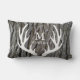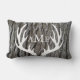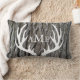Grey tree bark background with white deer antlers silhouette and your choice of monogram text on front and back! This lumbar pillow makes an excellent gift or accent for that cosy home tucked away in a beautiful woodland setting!