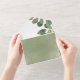 ALSO AVAILABLE WITH A QR CODE TO SCAN. Simple and elegant, this design features lush greenery and eucalyptus with a soft sage green watercolor background on the front. Personalised All-In-One invitations are a unique combination of both a beautifully printed custom invitation with an easy to tear off perforated RSVP postcard. And they are so easy to use! You simply fold, then seal the back flap with the three included clear stickers, and mail. And when your guests receive your custom invite, they just tear the perforated RSVP Card off and drop it back in the mail to you!