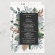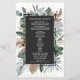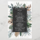 Palm leaves and other botanical designs around dark grey rectangle with white text.