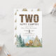 This fun rustic invitation has a wood panelled "TWO" and happy camper. The bottom has a watercolor forest, mountains and scenery. It is finished by the tan, green and brown camping items which include a tent and fireplace. The back has a pattern of the same watercolor tent.