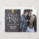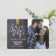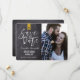 Script Typography Chalkboard Gold Banner Photo Save the Date Card. You can customise the bride and groom names, the wedding date, city and state as well as the info for what the wedding guests can expect next. You have to upload your photo too. If you need help personalising this save the date card drop me a line at requests@prettygreetings.co.uk
