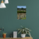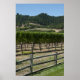 The scenic Rustic Vineyard Grape Fields Poster Print features a scenic landscape photograph of large fields of grapes growing in the hills and wine country of Napa Valley, California with a rustic weathered wooden fence in the foreground on a blue sky summer day.