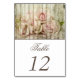 Rustic Vintage Wood and Roses Wedding Table Number. The design features rustic wood texture and pink roses.