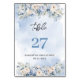 Rustic style watercolor designs, like the blue hydrangea, white roses, and eucalyptus greenery, are a charming choice for wedding table numbers. The soft, natural colours and delicate floral elements create an elegant and romantic atmosphere for the event. These intricate watercolor illustrations bring a touch of whimsy and sophistication to the table decor, perfect for a rustic-themed wedding celebration.