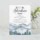Elegant rustic watercolor mountains and forest scene wedding invitation, featuring lush blue and green trees and mountains with a script text: let the adventure begin. For those who love a romantic dreamy woodland vibe for their ceremony and celebration. You may keep your names and date on the back of the invite or delete it.