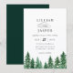 Rustic watercolor forest scene wedding invitation. Beautiful painted trees in trendy shades of green with coordinating emerald colour backing. Invitation features chic typography design style mix of calligraphy and bold type.