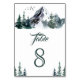 Elegant forest theme wedding table number card featuring beautiful mountains and pine trees on a white background.