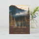 Rustic save the date. Misty mountain view scene with pine tress. Watercolor design, rich colours. Dark blue, gold, yellow, and browns.