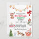 Rustic christmas winter theme party invitations featuring a simple white background, watercolor spruce trees, a vintage red truck, a xmas tree, and a traditional party template that is easy to personalise.
