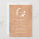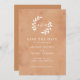This simple but elegant wedding save the date card features a peach and clay watercolor background with white text. At the top is space for the couple's initials inside of two hand drawn branches.