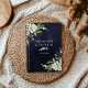 A must have when planning your wedding. Navy blue, textured background with a speckled rose gold splatter layer. Two beautiful antique, shabby chic, white rose bouquets in corners, one upper left and one lower right. This trendy design has a rustic, boho chic vibe.
