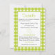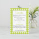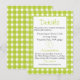 This details card features a timeless green and white check gingham pattern highlighting your party / event details printed in complementing green handwritten script and easy-to-read black fonts.